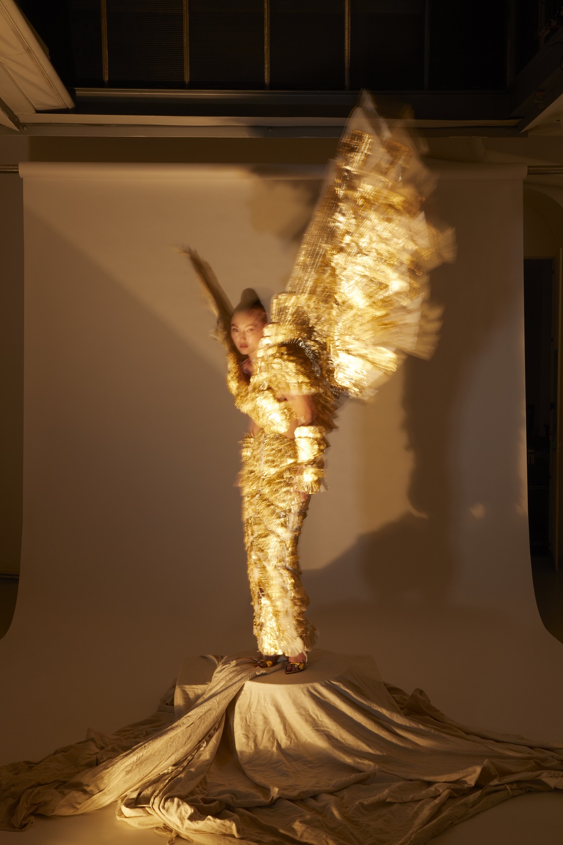Questo capolavoro di haute couture, dedicato al tema della sostenibilità, è realizzato con piume di seta Ahimsa, un tipo di seta “non violenta”, e decorato con piume dello stesso materiale. Attraverso un processo di plissettatura soleil eseguito manualmente, le piume conferiscono all’abito una tridimensionalità e un effetto illusorio, ricreando l’aspetto del colibrì. Inoltre, l’intero abito è rivestito da sottili foglie d’oro, trasformandolo in un’armatura lucente.