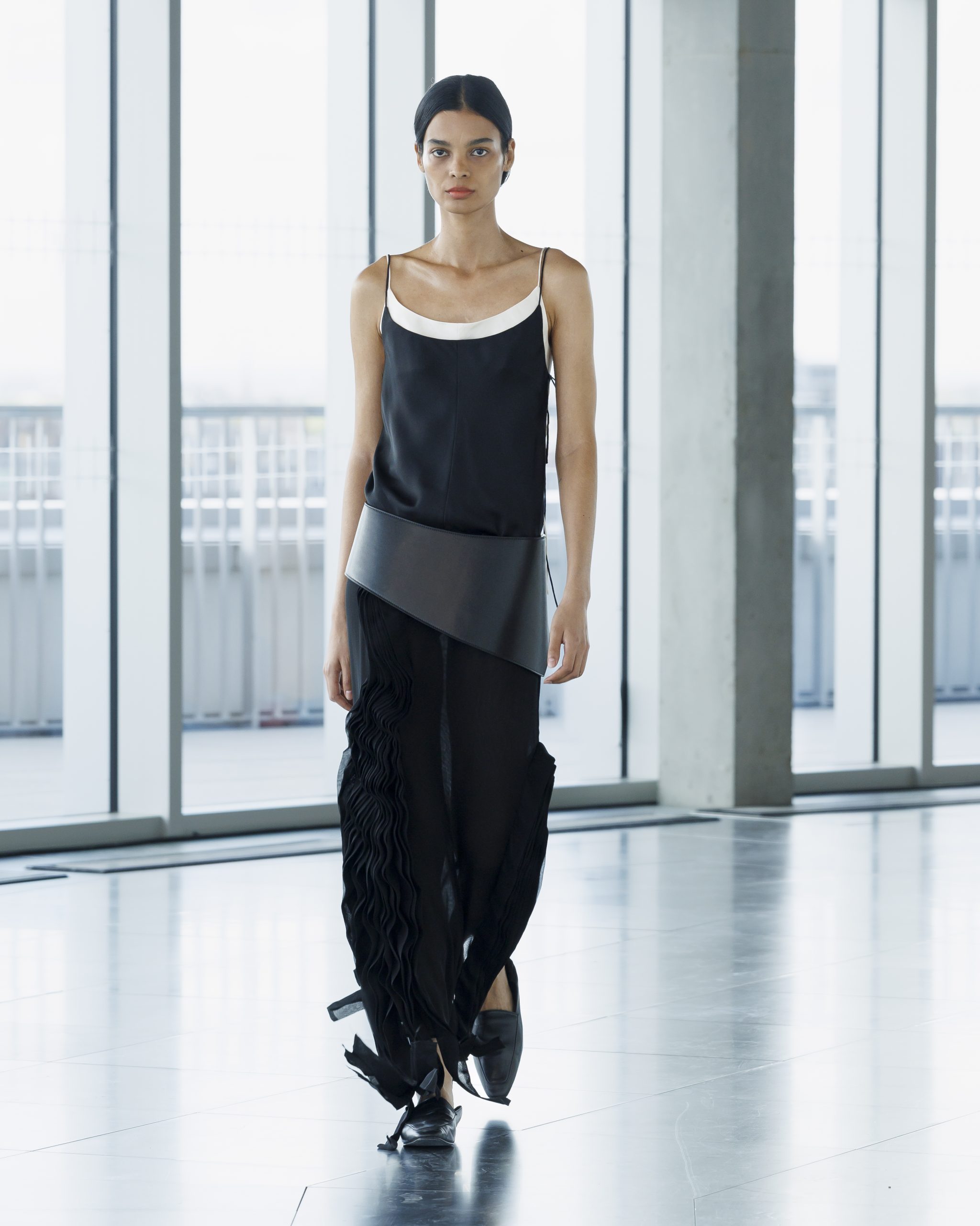 La ricchezza tattile prende forma nel suede desaturato dei trench oversize, nei fili di ciniglia lavorati a mano che intrecciano capispalla e abiti. La seta scivola in strati ondulati che catturano movimento e compostezza, mentre l’asimmetria attraversa cinture, drappeggi e silhouette destrutturate.